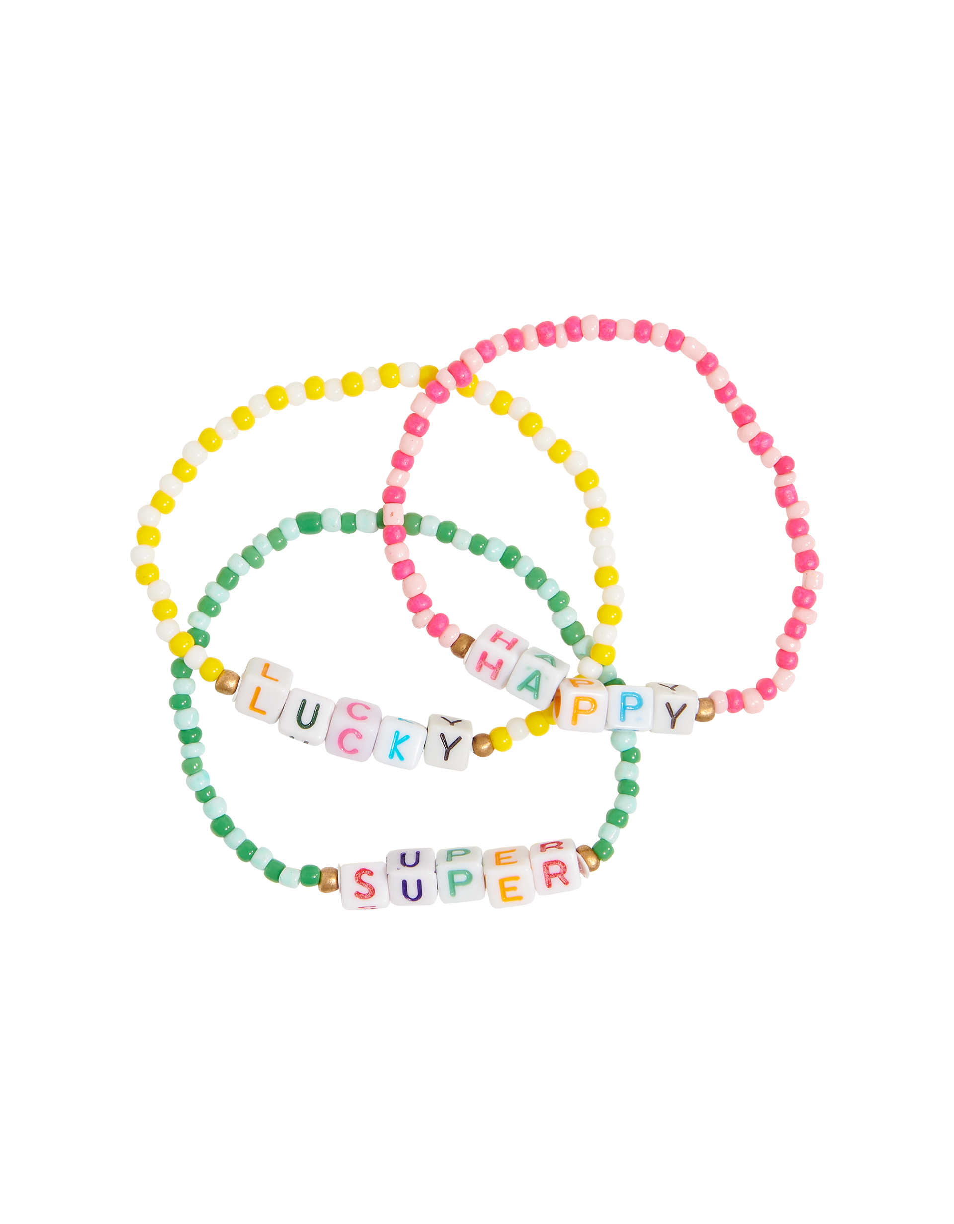 Vrolijke set van 3 elastieken armbandjes in de kleuren geel, groen en roze voorzien van de teksten, HAPPY, LUCKY, SUPER.