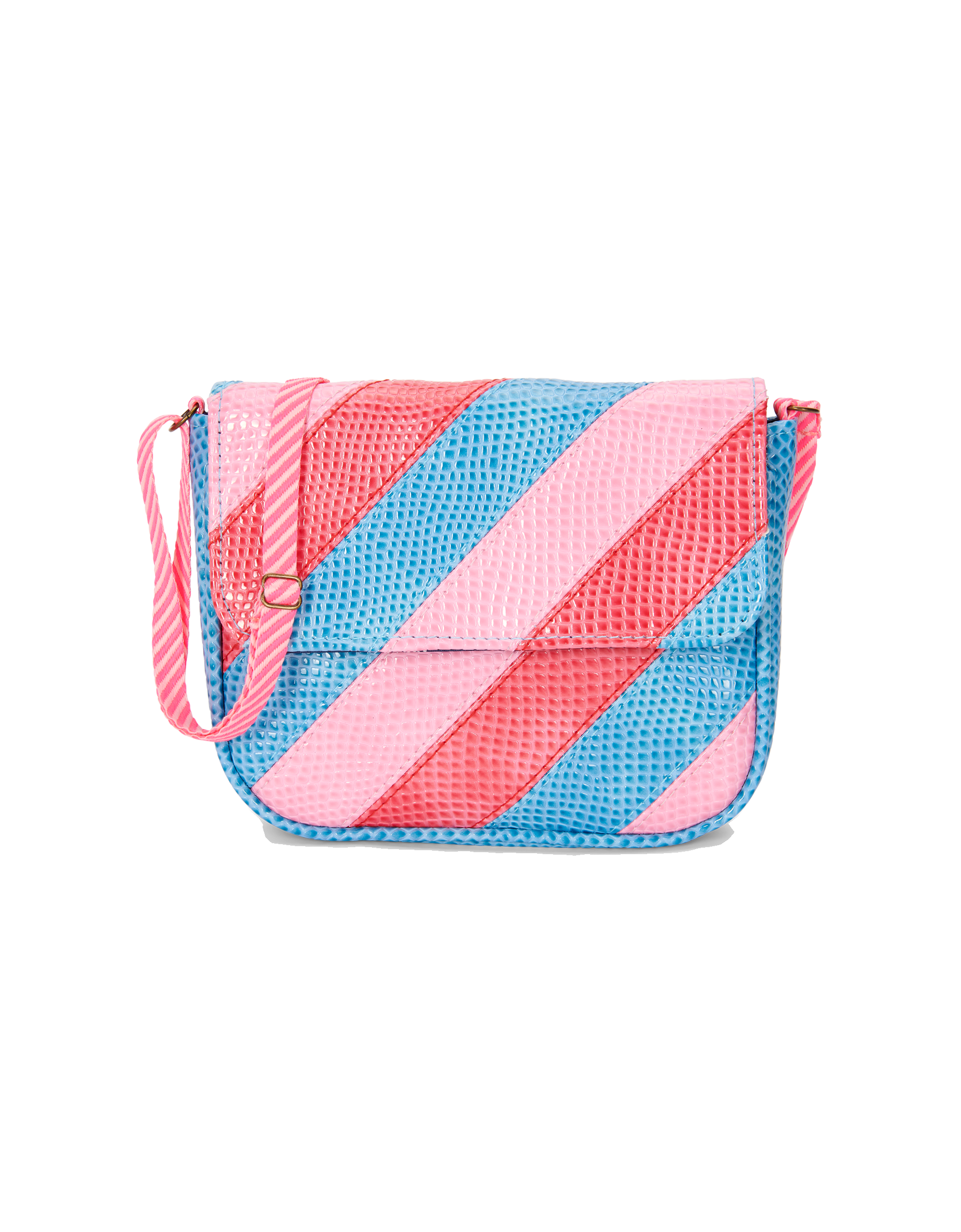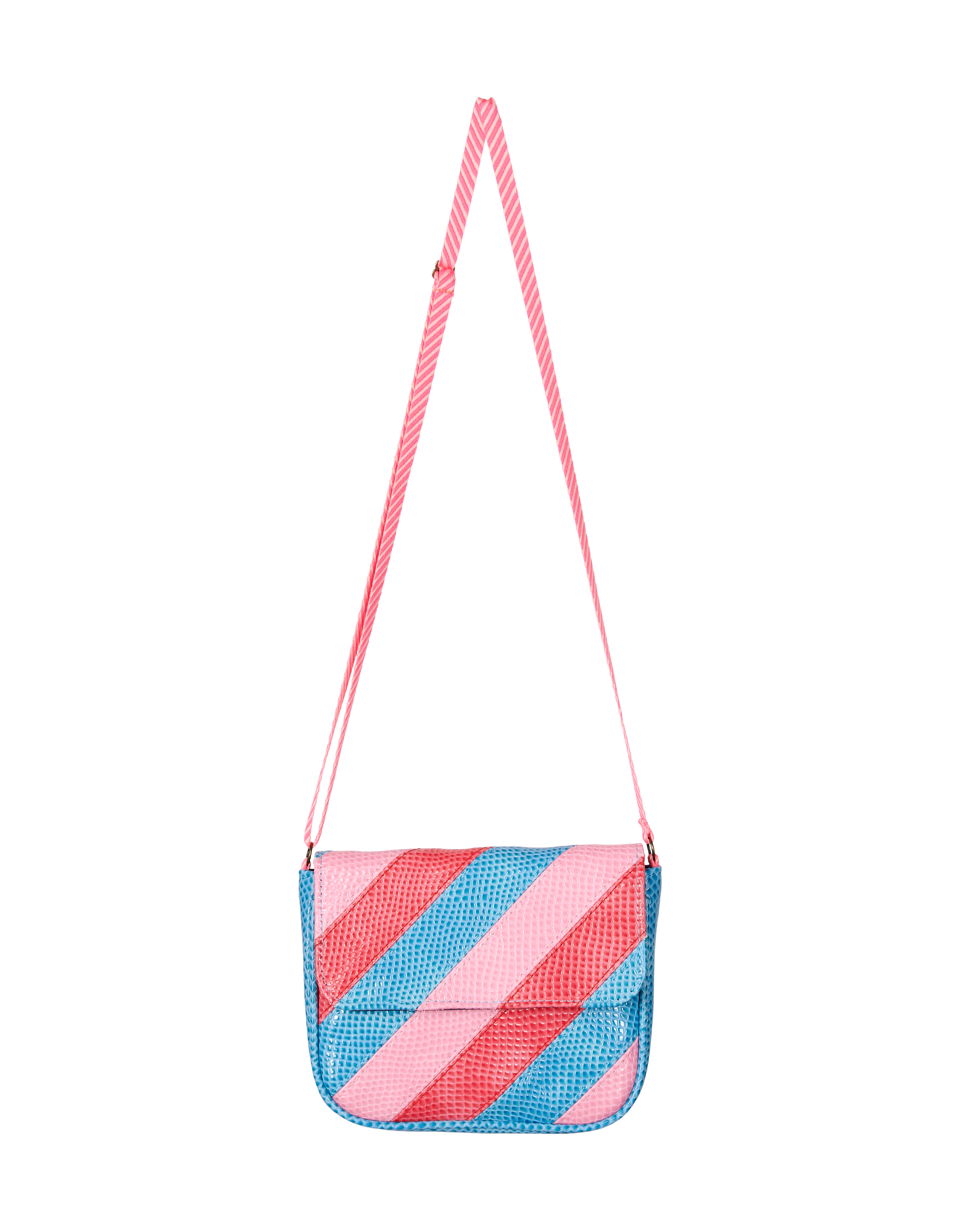 Mehrfarbige Umhängetasche von LE BIG. Schlangenhaut-Imitat in fröhlichen Farben. Die diagonalen Streifen machen sie zu einem echten Hingucker. Mit verstellbarem, gestreiftem Riemen und einem Druckknopf an der Innenseite der Klappe zum einfachen Öffnen und Schließen. Das Innenfutter ist mit unserem einzigartigen LE BIG-Print versehen. Die Maße sind: Höhe 13 cm, Breite 19 cm, Tiefe 5 cm.