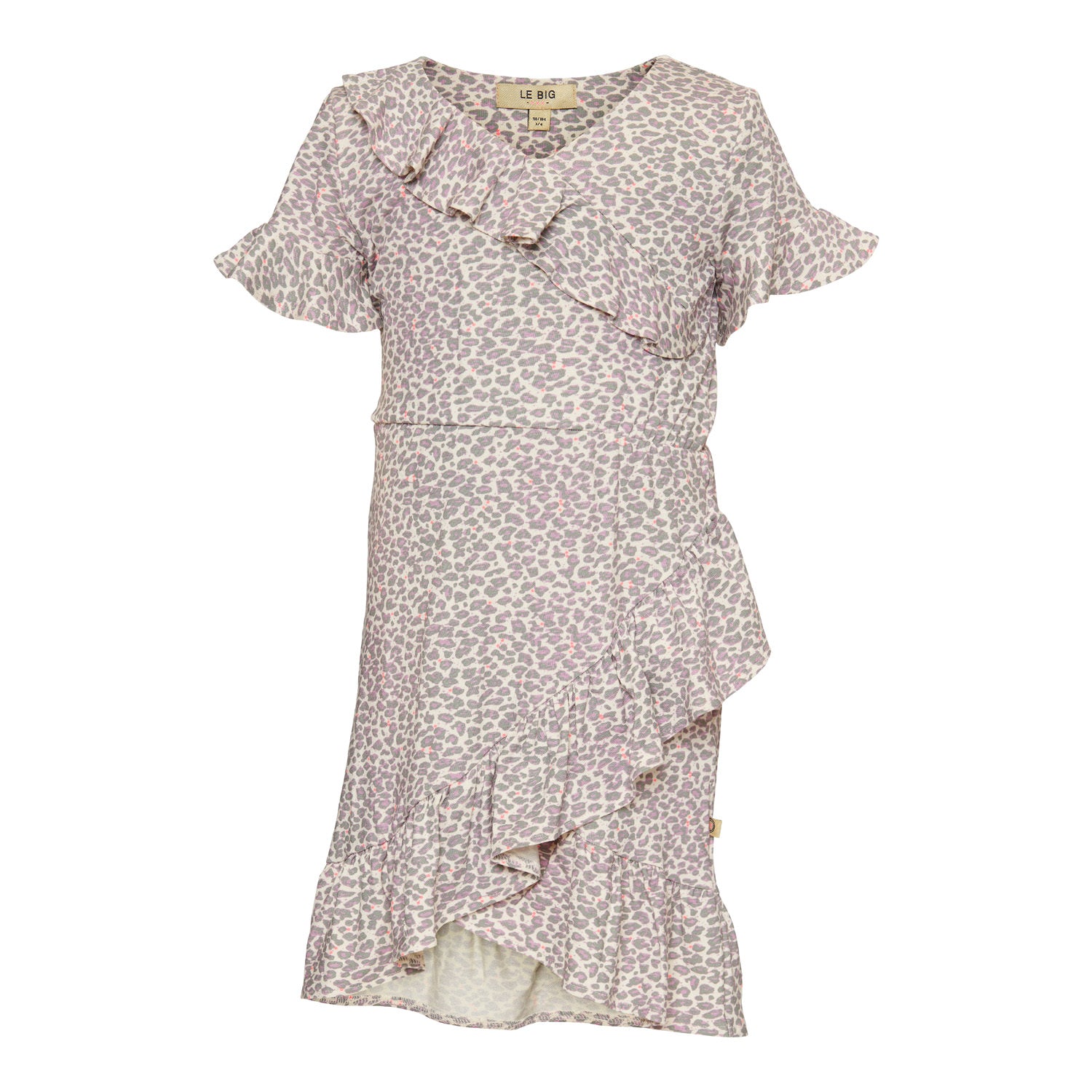 Langes Leopardenkleid von LE BIG. Mit diesem längeren Kleid zaubern Sie sommerliche Strandstimmung! Das Kleid ist im trendigen Leopardenmuster in Grün und Lavendel gehalten und hat überall feine, fließende Rüschen.