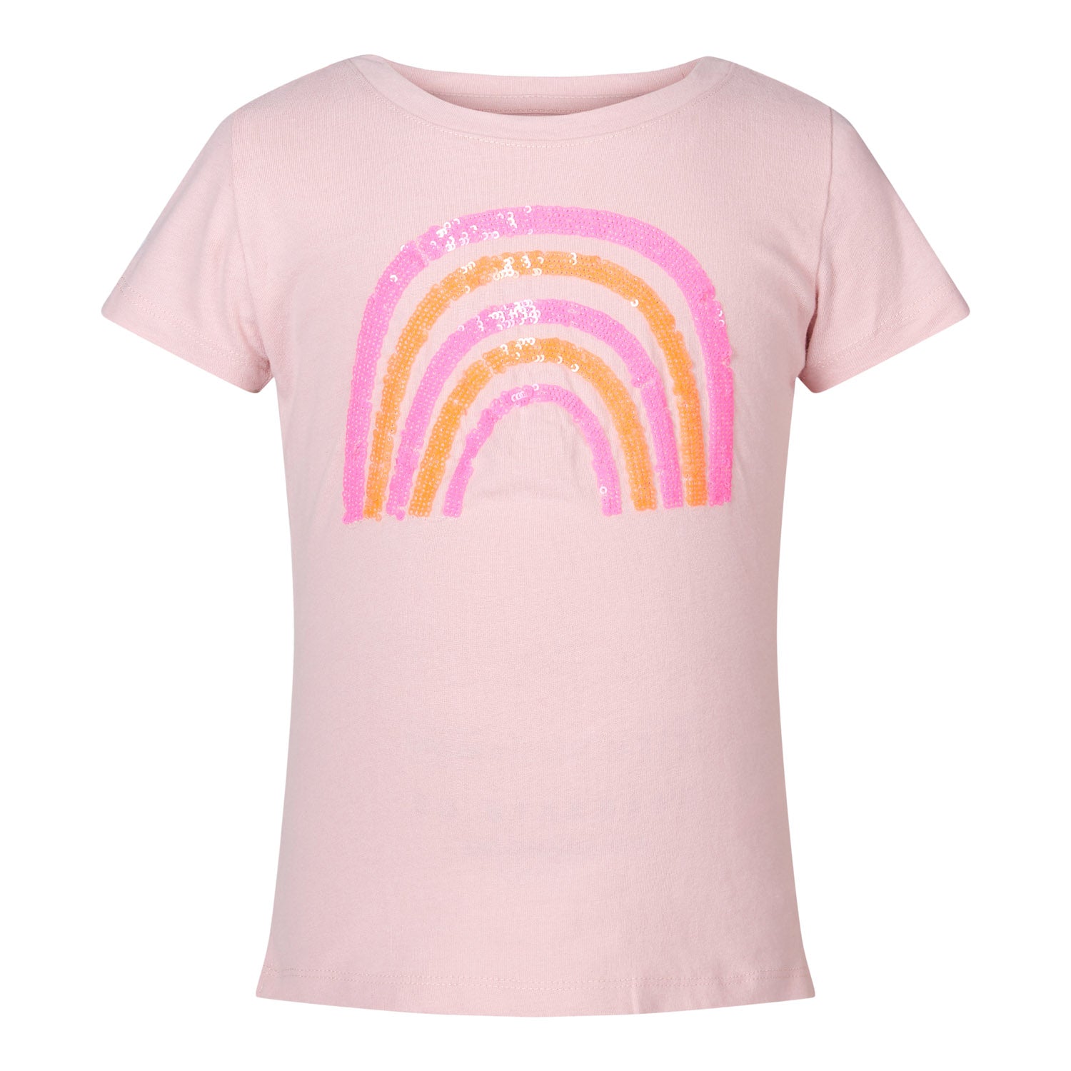 Pailletten Artwork t-shirt van LE BIG. T-shirt met korte mouw in super zacht katoen gedecoreerd met een grote pailetten regenboog in het neon pink en neon orange. T-shirt valt 1 maat kleiner, wij adviseren 1 maat groter te nemen.