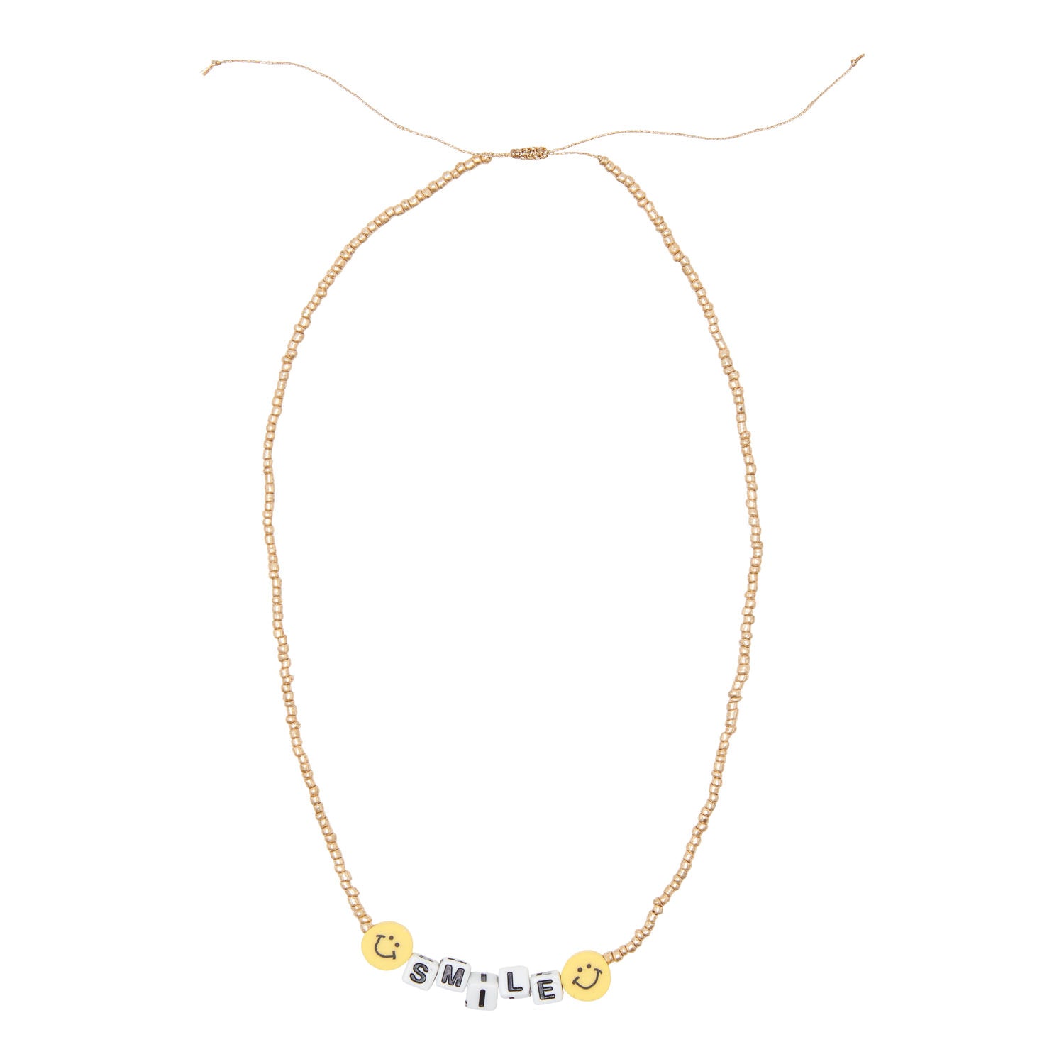 Gouden kralen ketting met de kralen letters SMILE en leuke gele smileys. Deze ketting heeft een makkelijke trekkoord sluiting. Match met de Britt armband voor een matching set.