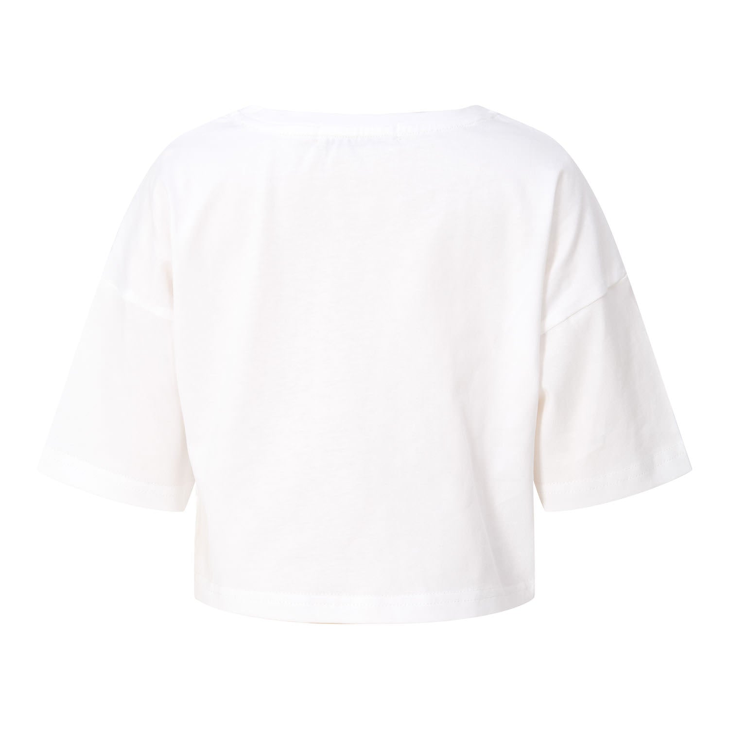 Meisjes T-shirt in een boxy kortere oversized fit. Gemaakt van zacht 100% katoen in fris wit. Voorzien van rode en licht blauwe harten patches en LE BIG logo op de mouw.