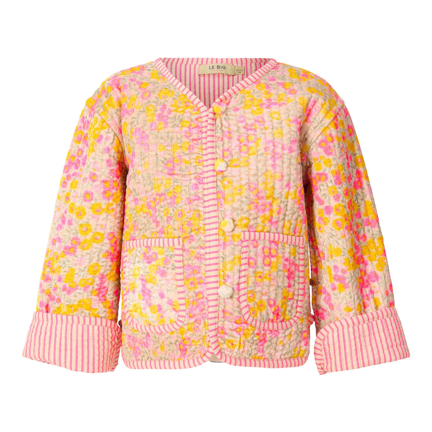 Zacht gewatteerd velours meisjes jasje van LE BIG. Dit unieke tussen jasje geeft jouw outfits kleur! Aan de ene kant een zachte velours met felle bloemenprint aan de andere kant katoen met een neon roze streepje. Het jasje is aan twee kanten draagbaar. Ook verkrijgbaar in gilet.