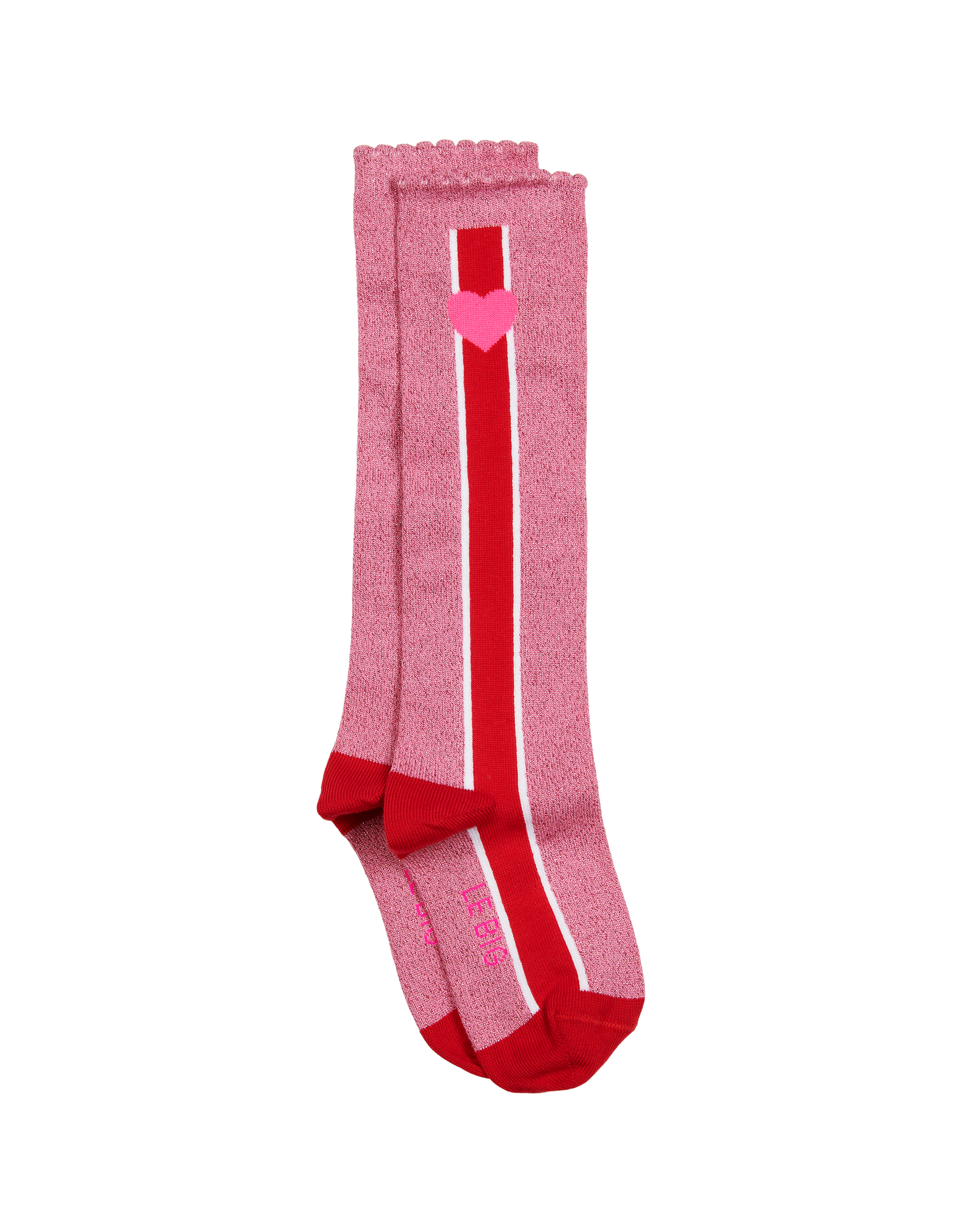 Glitter kniekous van LE BIG. Glitter kniekous met verticale contrast en witte strepen op de zijkant en een hartje aan de bovenkant. Gemaakt van super zacht katoen met stretch. Kous komt tot net onder de knie. Gemaakt in onze fabriek in Portugal. Bekijk nu alle meisjes kniekousen!