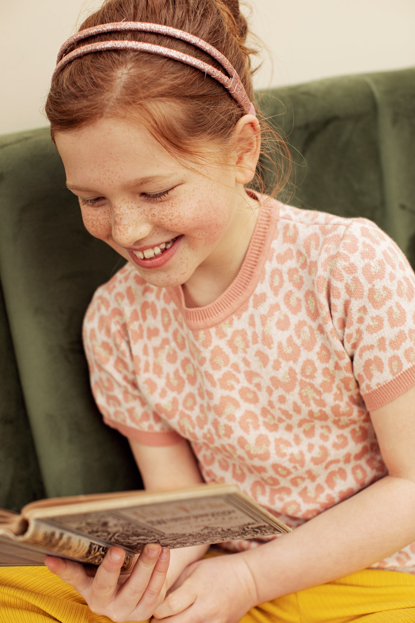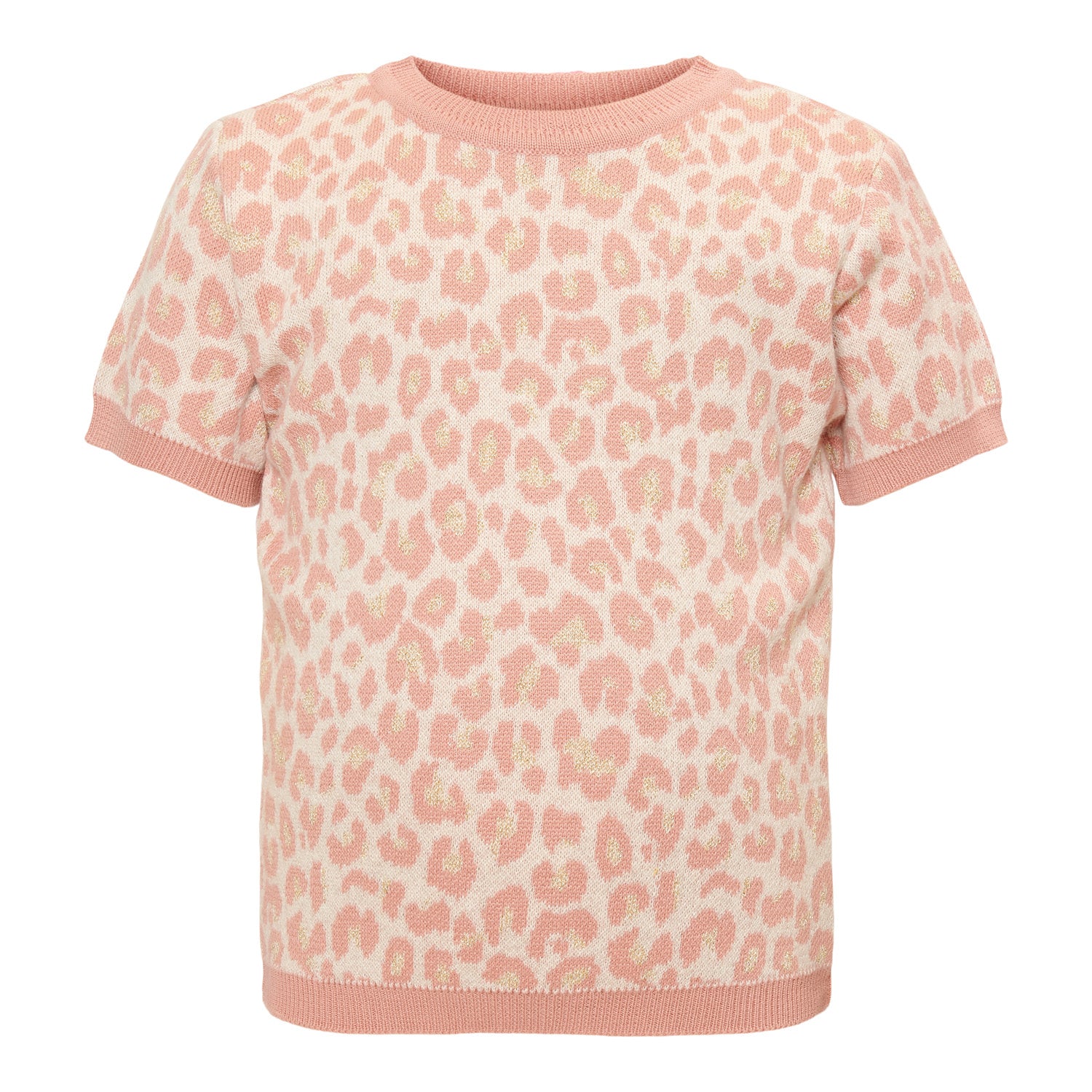 Gebreide luipaard print top van LE BIG. Deze gebreide sweater top met korte mouw in luipaard patroon en glitter details is een must have voor alle luipaard print fans! Gemaakt in een rustige kleurcombinatie, van beige melange met dawn pink en een subtiel gouden glittertje.