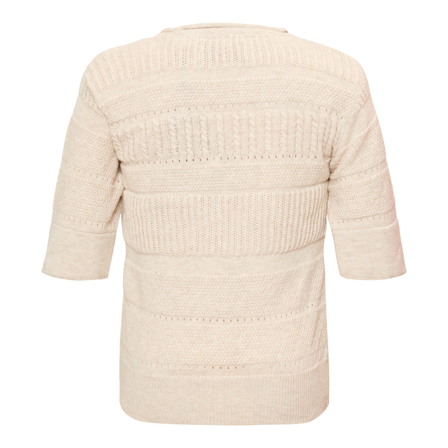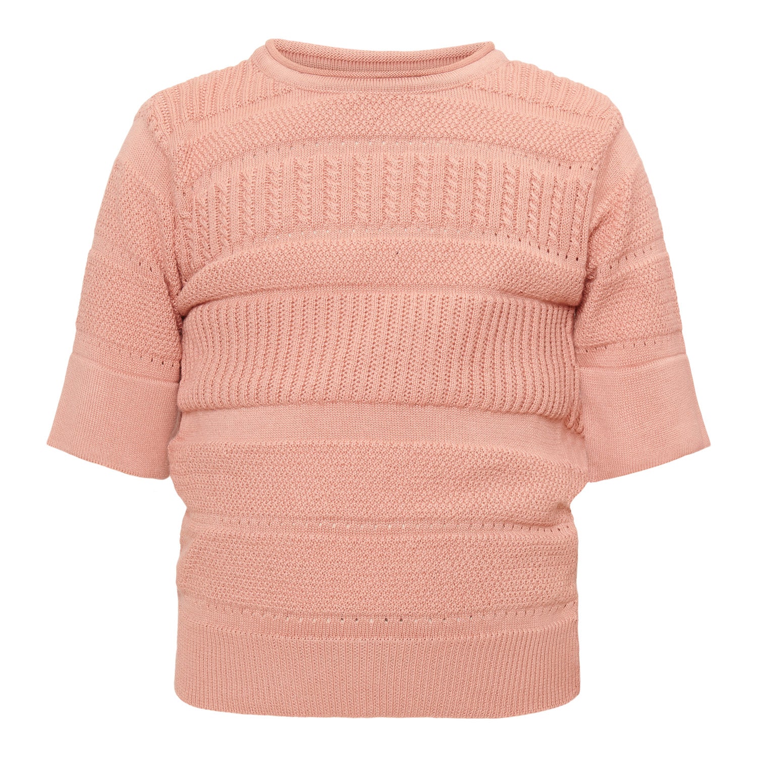 Prachtig gebreide top van LE BIG. Deze gebreide sweater top met korte mouw is uitgevoerd in een divers ajour patroon en is gemaakt van super zacht katoen garen. Deze top draag je het hele jaar door en is absoluut een LE BIG essential die je niet mag missen.
