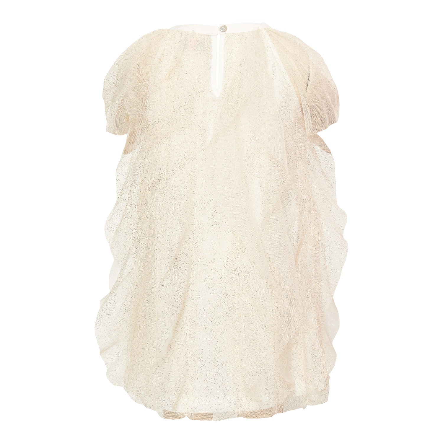 Gebroken witte feestjurk van LE BIG. Deze geweldig mooie meisjes feest jurk met katoenen voering is gemaakt van een super zachte tulle stof, en bedrukt met een gouden spray print. In deze charmante A-lijn jurk met elegant mouwtje en tule laagjes ben jij de stralende ster van het feestje!