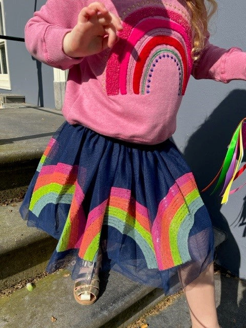 LE BIG tule rokje met pailletten regenboog. Dubbellaags donker blauw tule met op de buitenste laag regenbogen gemaakt van verschillende kleuren pailletten. Ook dit tule rokje heeft een katoenen voering. Het rokje heeft een glitter blauwe elastieken band.