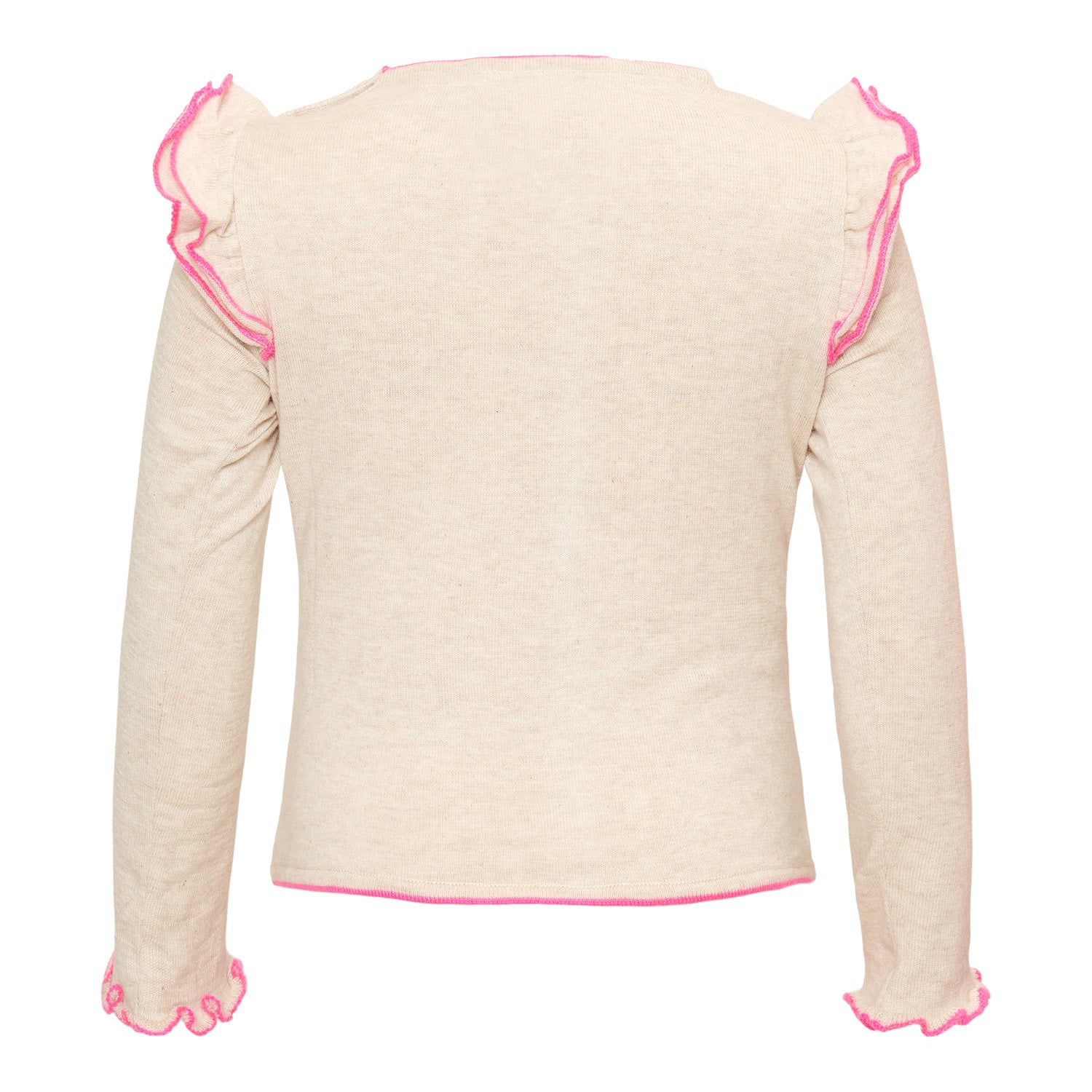 Beige melange sweater van LE BIG. Haar all-time favourite item, gemaakt in super zacht katoen garen. De ruches met neon pink detail zorgen ervoor dat dit een echte LE BIG is! Check onze website voor meer LE BIG Essentials.